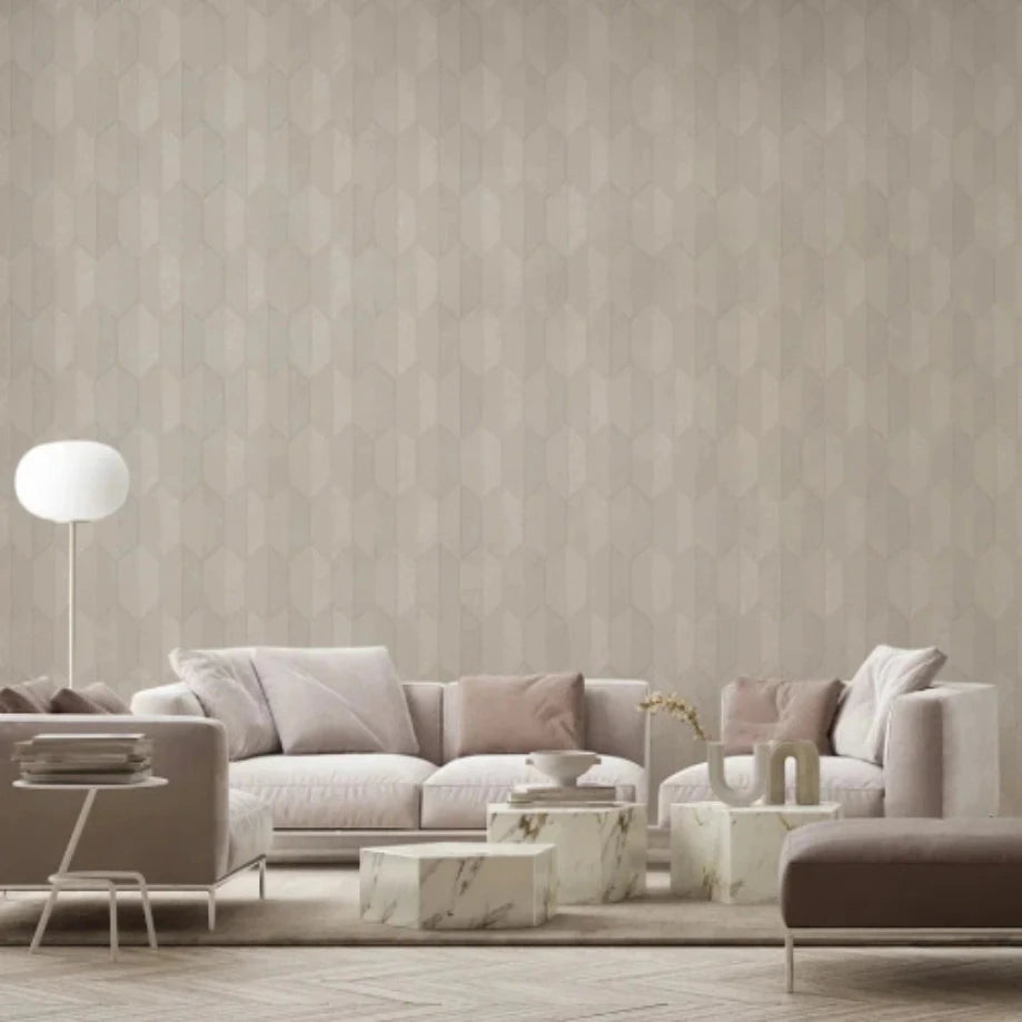 Designet er inspireret af geometriske former og moderne æstetik, hvor de skrå linjer skaber en følelse af bevægelse og dybde. De forskellige beige nuancer tilføjer en smuk variation, der giver tapetet en elegant og afbalanceret udstråling, hvilket gør det velegnet til mange forskellige indretningsstile.