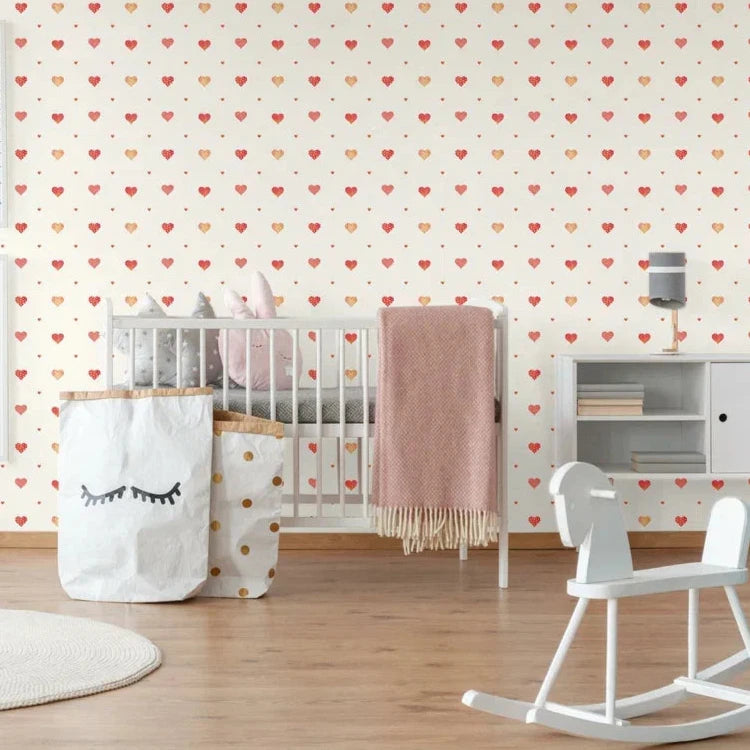 The My Heart wallpaper is ideal for children's rooms and playrooms where you want to add a sense of joy and personality. It works both as an eye-catching accent wall and as a complete wall covering that adds warmth and beauty to the room.