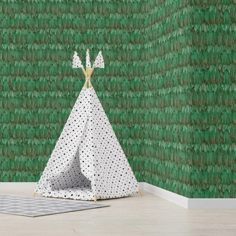 Designet er inspireret af naturens egne strukturer, hvor hver fjer ligger som et stille penselstrøg. Farverne skifter diskret mellem grøn og grå, hvilket gør tapetet både levende og afdæmpet på samme tid. Resultatet er et udtryk, der virker beroligende og indbydende – perfekt til soveværelset, stuen eller ethvert rum, hvor du ønsker en følelse af fred.