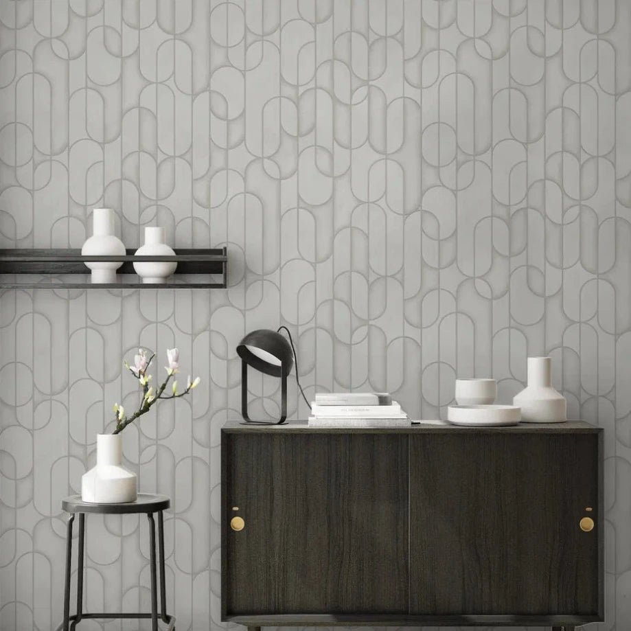 Designet imiterer teksturen og udseendet af store kapsler indrammet med skønne sølvkanter. De grålige farver skaber en sofistikeret base, mens den metalliske finish tilføjer en dynamisk dimension, der skifter med belysning og betragtningsvinkel. Dette tapet er ideelt til moderne indretninger, og fungerer perfekt som en statement-væg i stuen, soveværelset eller kontoret.