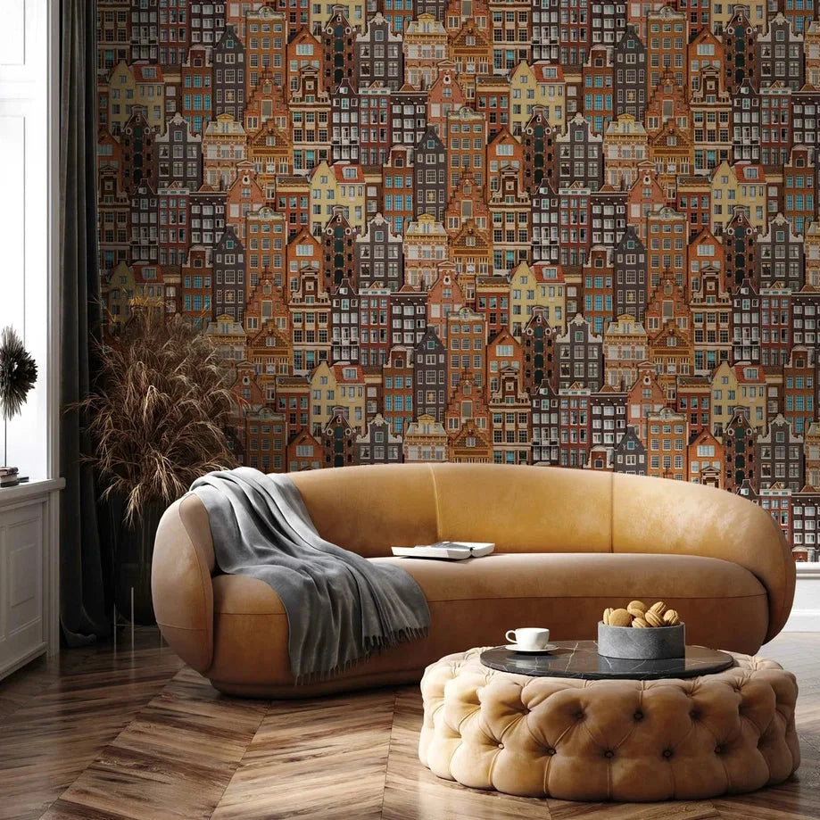 Designet fanger essensen af bylivet med detaljerede bygningsfacader, der hver især fortæller en historie gennem deres farver og strukturer. De store vinduer tilføjer en følelse af åbenhed og lys, mens tagene med forskellige typer tegl og tagsten giver en autentisk og varieret tekstur, der tilføjer dybde og karakter til tapetet.