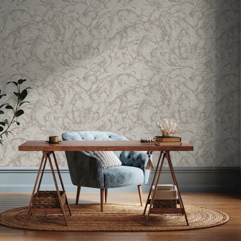 Den camouflerede baggrund skaber en stemning af dybde og kompleksitet, hvilket tilføjer en interessant visuel tekstur til væggene. De kobber farvede farvesprøjt tilføjer kontrast og drama, og skaber en visuel fokuspunkt, der fanger opmærksomheden og tilfører en subtil glød til rummet.