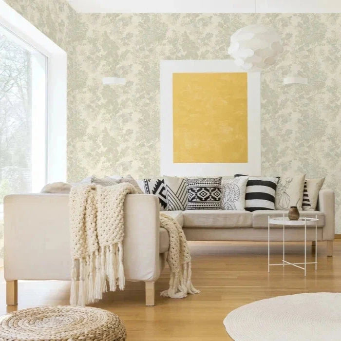 Designet præsenterer en delikat sammensætning af blade i grå, beige og cremede nuancer, der skaber en harmonisk og afslappende atmosfære. Farvepaletten er nøje udvalgt for at bringe en følelse af lys og subtilitet, hvilket gør det nemt at integrere tapetet i forskellige indretningsstile, fra moderne til klassisk.