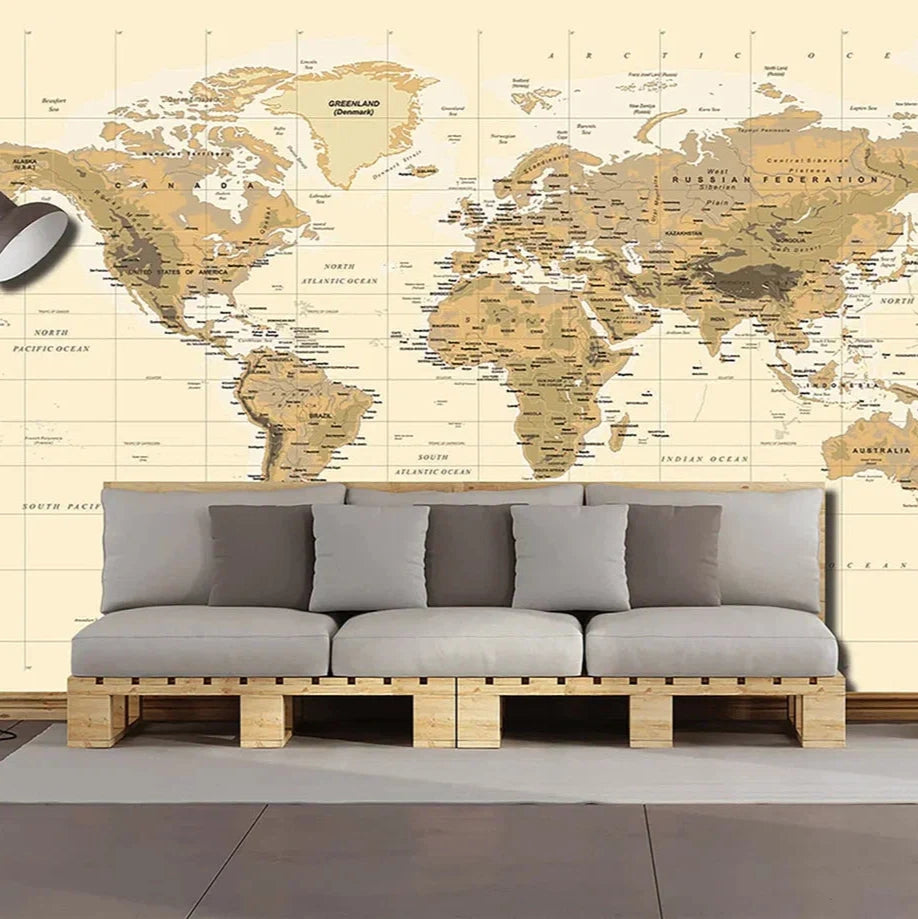 Verdenskort er et væg-til-væg tapet, der bringer hele verden ind i dit hjem på en stilfuld og funktionel måde. Med sin afdæmpede farvepalet i beige og brune nuancer, giver dette tapet en klassisk og tidløs følelse, samtidig med at det er fuldt detaljeret med geografiske navne og kontinentale afmærkninger. Det perfekte valg for rejselystne eller dem, der ønsker at tilføje et globalt perspektiv til deres boligindretning.